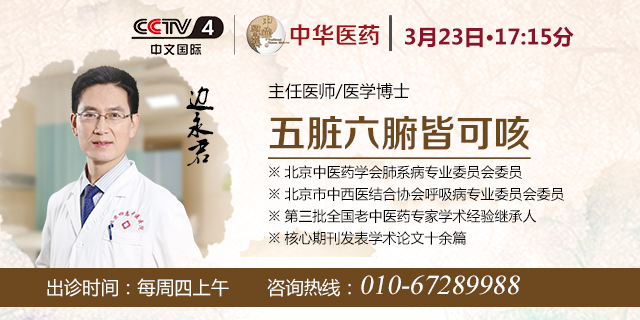 2019年 3月 23日17:15分,中華中醫(yī)藥學(xué)會肺系病分會委員、北京市中醫(yī)藥學(xué)會肺系病專業(yè)委員會委員以及變態(tài)反應(yīng)專業(yè)委員會委員、第三批全國老中醫(yī)藥專家學(xué)術(shù)經(jīng)驗繼承人、北京四惠中醫(yī)醫(yī)院特聘專家邊永君主任受邀做客CCTV-4《中華醫(yī)藥》欄目,為大家講解五臟六腑皆可咳的真相。邊永君主任曾多次受邀做客北京衛(wèi)視《養(yǎng)生堂》、《大醫(yī)本草堂》等知名養(yǎng)生節(jié)目,深受廣大觀眾喜愛。